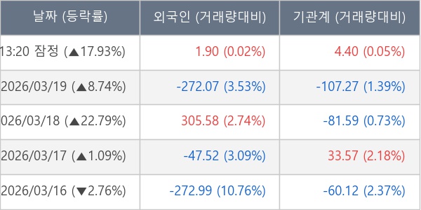 [서울=뉴스핌] 로보뉴스 = 20일 13시 30분 현재 대우건설(047040)은 외국인과 기관이 각각 1.90 만 주, 4.40 만 주 순매수(잠정) 하면서 전일 대비 17.93% (현재가 19,070원) 상승하고 있다.