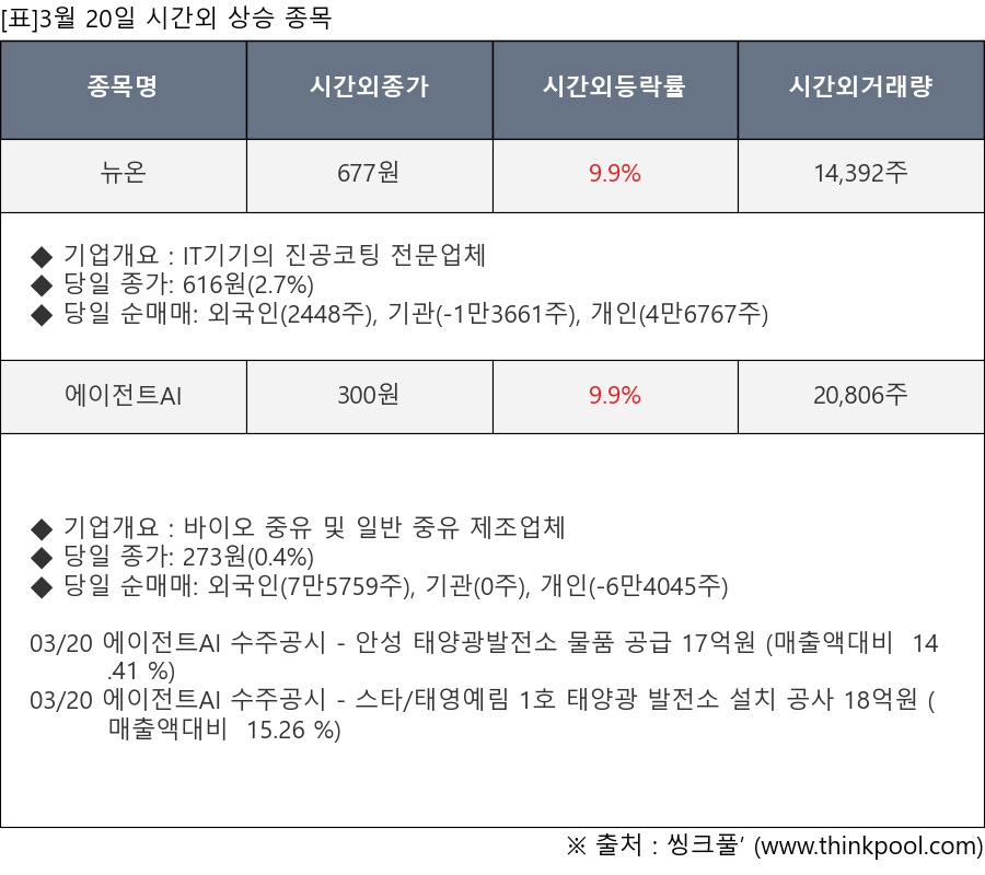 [서울=뉴스핌] 로보뉴스 = 3월 20일, 인공지능 투자비서 ‘AI라씨로’는 시간외 단일가 매매에서 주가가 크게 변동한 뉴온(123840), 에이전트AI(060900) 등의 최근 동향을 분석해서 발표했다.