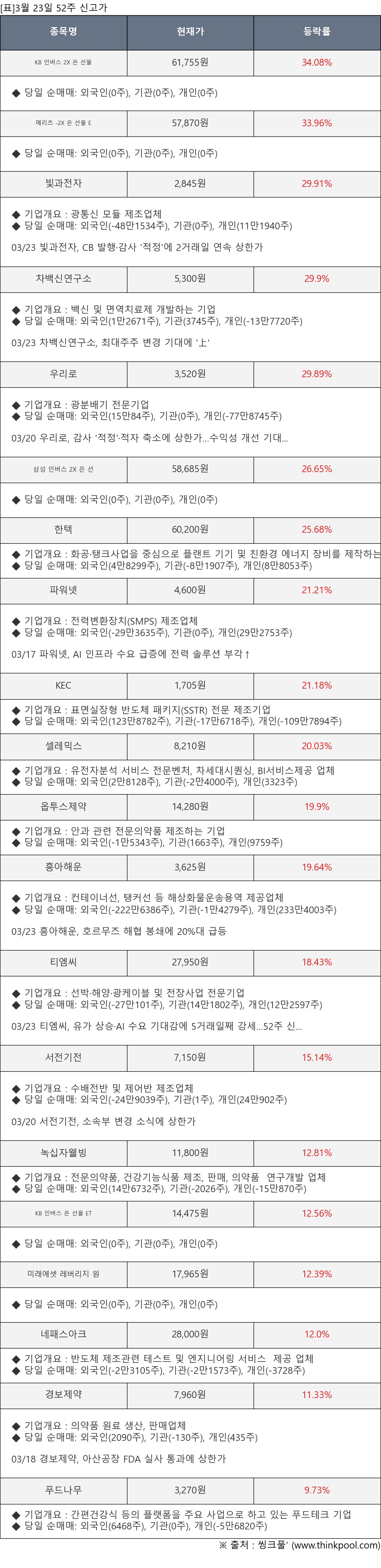 [서울=뉴스핌] 로보뉴스 = 3월 23일, 인공지능 투자비서 ‘AI라씨로’가 KB 인버스 2X 은 선물(580081), 메리츠 -2X 은 선물 E(610101) 등 52주 신고가가 발생한 종목들에 대한 최근 동향을 분석했다.