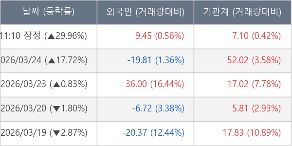 [서울=뉴스핌] 로보뉴스 = 25일 11시 30분 현재 부광약품(003000)은 전일 대비 29.96% (현재가 9,240원) 상승했고, 기관이 최근 11일 연속 순매수(누적 267.93만 주, 잠정) 행진을 하고 있다.