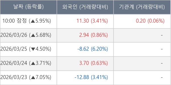 [서울=뉴스핌] 로보뉴스 = 27일 10시 15분 현재 씨티케이(260930)는 외국인과 기관이 각각 11.30 만 주, 0.20 만 주 순매수(잠정) 하면서 전일 대비 5.95% (현재가 4,630원) 상승하고 있다.