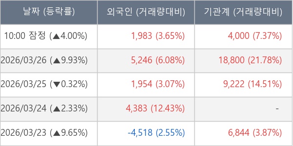 [서울=뉴스핌] 로보뉴스 = 27일 10시 15분 현재 에스에스알(275630)은 외국인과 기관이 각각 0.20 만 주, 0.40 만 주 순매수(잠정) 하면서 전일 대비 4.00% (현재가 3,510원) 상승하고 있다.
