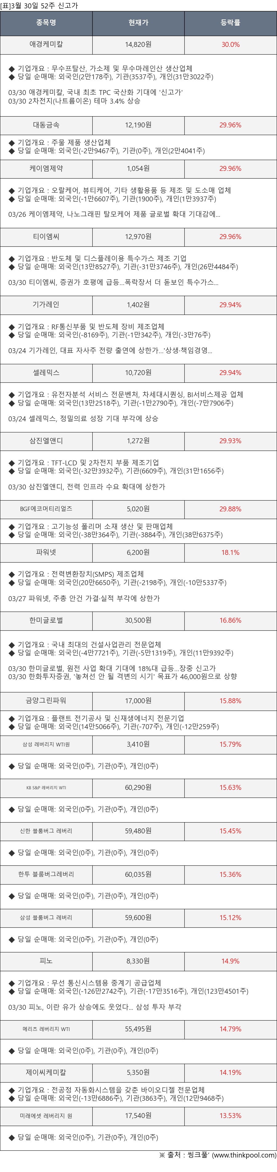 [서울=뉴스핌] 로보뉴스 = 3월 30일, 인공지능 투자비서 ‘AI라씨로’는 52주 신고가가 발생한 애경케미칼(161000), 대동금속(020400) 등의 최근 동향을 분석해서 발표했다.