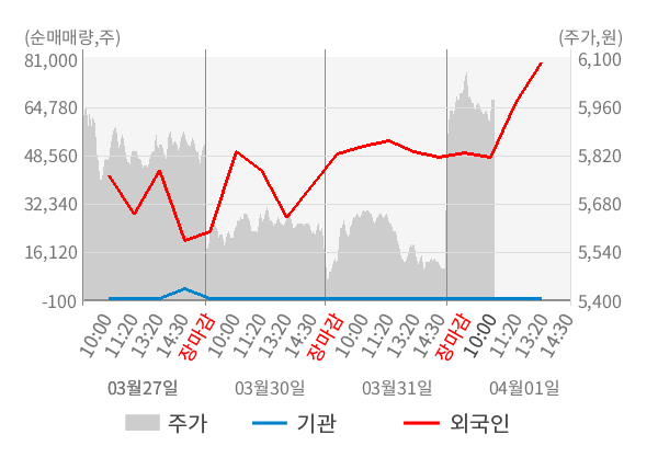 [서울=뉴스핌] 로보뉴스 = 01일 10시 15분 현재 대림바스(005750)는 전일 대비 9.11% (현재가 5,990원) 상승했고, 외국인이 최근 6일 연속 순매수(누적 91,544주, 잠정) 행진을 하고 있다.