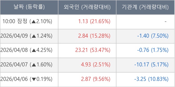 [서울=뉴스핌] 로보뉴스 = 10일 10시 15분 현재 한국알콜(017890)은 전일 대비 2.10% (현재가 11,660원) 상승했고, 외국인이 최근 5일 연속 순매수(누적 34.98만 주, 잠정) 행진을 하고 있다.