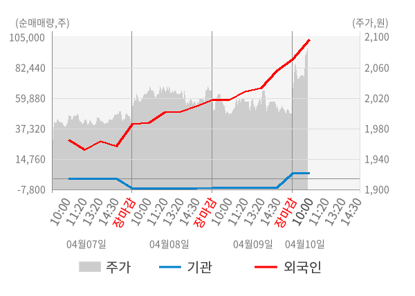 [서울=뉴스핌] 로보뉴스 = 10일 10시 15분 현재 디와이덕양(024900)은 전일 대비 4.25% (현재가 2,085원) 상승했고, 외국인이 최근 6일 연속 순매수(누적 12.80만 주, 잠정) 행진을 하고 있다.