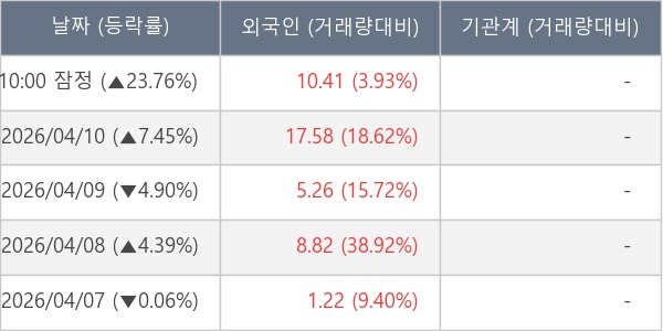 [서울=뉴스핌] 로보뉴스 = 13일 10시 15분 현재 알체라(347860)는 전일 대비 23.76% (현재가 2,375원) 상승했고, 외국인이 최근 6일 연속 순매수(누적 47.39만 주, 잠정) 행진을 하고 있다.