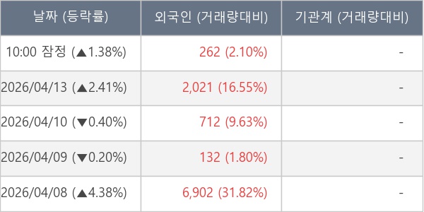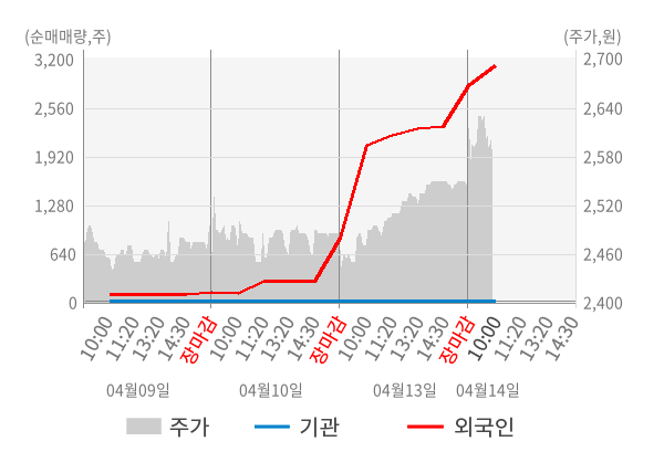 [서울=뉴스핌] 로보뉴스 = 14일 10시 15분 현재 바이브컴퍼니(301300)는 전일 대비 1.38% (현재가 2,580원) 상승했고, 외국인이 최근 5일 연속 순매수(누적 10,029주, 잠정) 행진을 하고 있다.