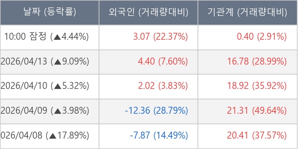 [서울=뉴스핌] 로보뉴스 = 14일 10시 15분 현재 예스티(122640)는 전일 대비 4.44% (현재가 28,200원) 상승했고, 기관이 최근 6일 연속 순매수(누적 89.92만 주, 잠정) 행진을 하고 있다.