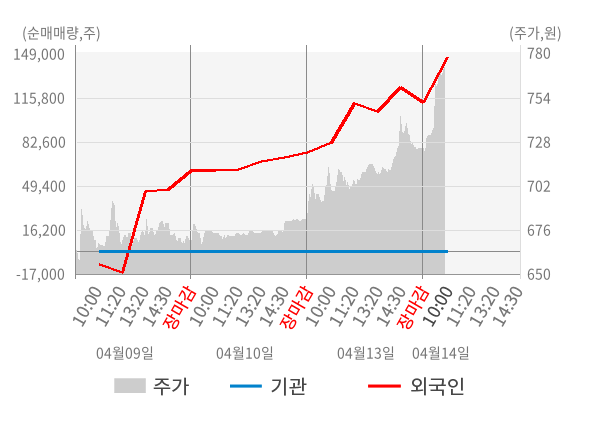 [서울=뉴스핌] 로보뉴스 = 14일 10시 15분 현재 한주라이트메탈(198940)은 전일 대비 6.63% (현재가 772원) 상승했고, 외국인이 최근 6일 연속 순매수(누적 20.69만 주, 잠정) 행진을 하고 있다.
