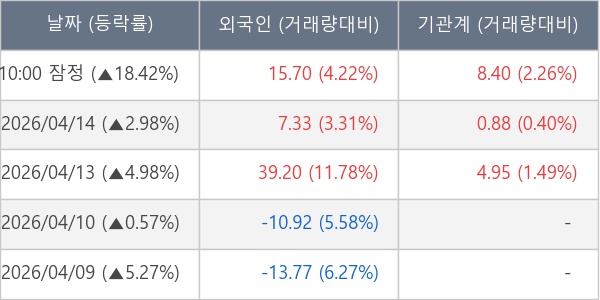 [서울=뉴스핌] 로보뉴스 = 15일 10시 15분 현재 저스템(417840)은 외국인과 기관이 각각 15.70 만 주, 8.40 만 주 순매수(잠정) 하면서 전일 대비 18.42% (현재가 9,000원) 상승하고 있다.
