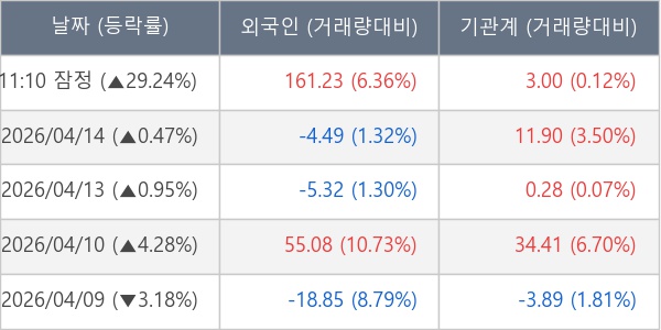 [서울=뉴스핌] 로보뉴스 = 15일 11시 30분 현재 대한전선(001440)은 외국인과 기관이 각각 161.23 만 주, 3.00 만 주 순매수(잠정) 하면서 전일 대비 29.24% (현재가 41,550원) 상승하고 있다.