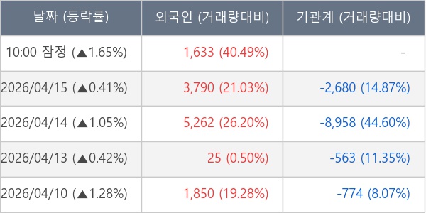 [서울=뉴스핌] 로보뉴스 = 16일 10시 15분 현재 쿠쿠홈시스(284740)는 전일 대비 1.65% (현재가 24,600원) 상승했고, 외국인이 최근 7일 연속 순매수(누적 13,798주, 잠정) 행진을 하고 있다.