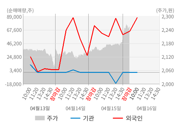 [서울=뉴스핌] 로보뉴스 = 16일 10시 15분 현재 디와이덕양(024900)은 전일 대비 3.20% (현재가 2,255원) 상승했고, 외국인이 최근 10일 연속 순매수(누적 32.96만 주, 잠정) 행진을 하고 있다.