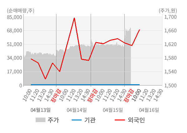 [서울=뉴스핌] 로보뉴스 = 16일 10시 15분 현재 삼기에너지솔루션즈(419050)는 전일 대비 3.42% (현재가 1,664원) 상승했고, 외국인이 최근 5일 연속 순매수(누적 15.83만 주, 잠정) 행진을 하고 있다.