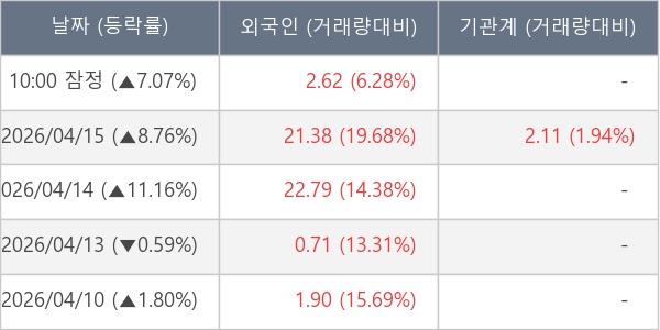 [서울=뉴스핌] 로보뉴스 = 16일 10시 15분 현재 메가터치(446540)는 전일 대비 7.07% (현재가 5,450원) 상승했고, 외국인이 최근 8일 연속 순매수(누적 53.38만 주, 잠정) 행진을 하고 있다.