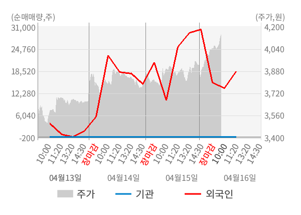 [서울=뉴스핌] 로보뉴스 = 16일 11시 30분 현재 앤디포스(238090)는 전일 대비 5.61% (현재가 4,145원) 상승했고, 외국인이 최근 5일 연속 순매수(누적 32,930주, 잠정) 행진을 하고 있다.