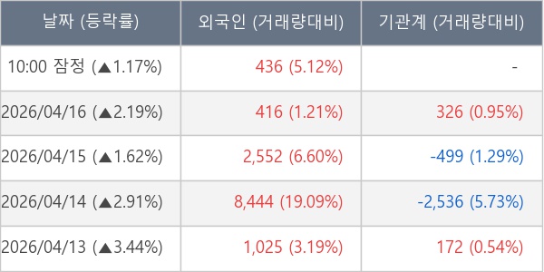 [서울=뉴스핌] 로보뉴스 = 17일 10시 15분 현재 내츄럴엔도텍(168330)은 전일 대비 1.17% (현재가 2,600원) 상승했고, 외국인이 최근 5일 연속 순매수(누적 12,873주, 잠정) 행진을 하고 있다.