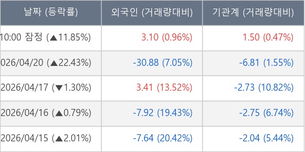 [서울=뉴스핌] 로보뉴스 = 21일 10시 15분 현재 동아엘텍(088130)은 외국인과 기관이 각각 3.10 만 주, 1.50 만 주 순매수(잠정) 하면서 전일 대비 11.85% (현재가 10,380원) 상승하고 있다.