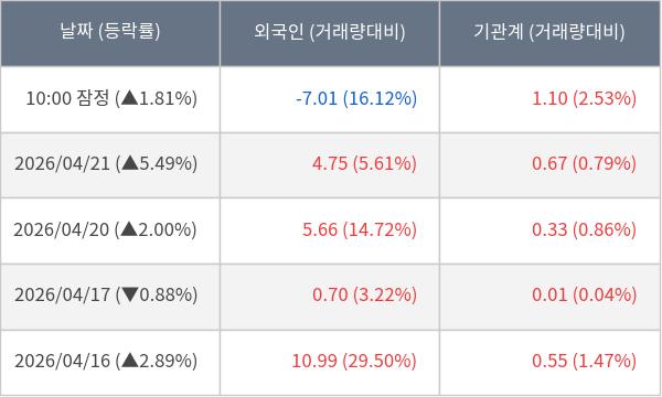 [서울=뉴스핌] 로보뉴스 = 22일 10시 15분 현재 TCC스틸(002710)은 전일 대비 1.81% (현재가 18,580원) 상승했고, 기관이 최근 5일 연속 순매수(누적 26,569주, 잠정) 행진을 하고 있다.