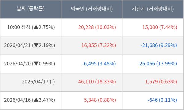 [서울=뉴스핌] 로보뉴스 = 22일 10시 15분 현재 삼양엔씨켐(482630)은 외국인과 기관이 각각 2.02 만 주, 1.50 만 주 순매수(잠정) 하면서 전일 대비 2.75% (현재가 20,150원) 상승하고 있다.