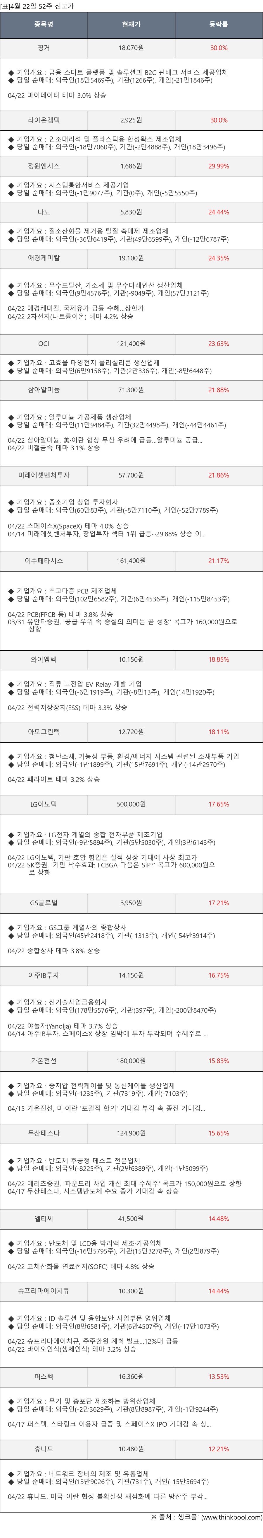 [서울=뉴스핌] 로보뉴스 = 4월 22일, 인공지능 투자비서 ‘AI라씨로’가 52주 신고가가 발생한 핑거(163730), 라이온켐텍(171120) 등에 대해 최근 동향을 분석했다.