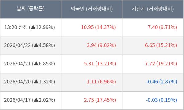 [서울=뉴스핌] 로보뉴스 = 23일 13시 30분 현재 해성디에스(195870)는 외국인과 기관이 각각 10.95 만 주, 7.40 만 주 순매수(잠정) 하면서 전일 대비 12.99% (현재가 77,400원) 상승하고 있다.