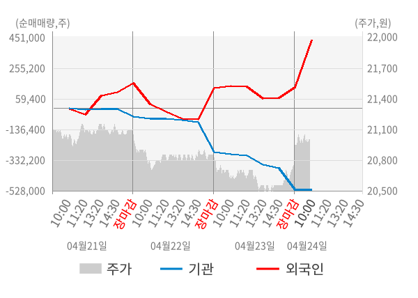 [서울=뉴스핌] 로보뉴스 = 24일 10시 15분 현재 HMM(011200)는 외국인과 기관이 각각 31.94 만 주, 0.10 만 주 순매수(잠정) 하면서 전일 대비 1.20% (현재가 21,000원) 상승하고 있다.