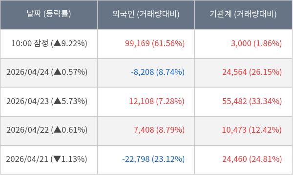 [서울=뉴스핌] 로보뉴스 = 27일 10시 15분 현재 제이에스코퍼레이션(194370)은 전일 대비 9.22% (현재가 15,400원) 상승했고, 기관이 최근 5일 연속 순매수(누적 11.80만 주, 잠정) 행진을 하고 있다.