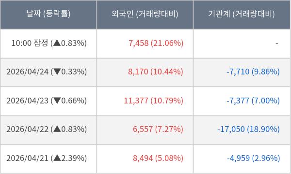 [서울=뉴스핌] 로보뉴스 = 27일 10시 15분 현재 신성델타테크(065350)는 전일 대비 0.83% (현재가 60,400원) 상승했고, 외국인이 최근 5일 연속 순매수(누적 42,056주, 잠정) 행진을 하고 있다.