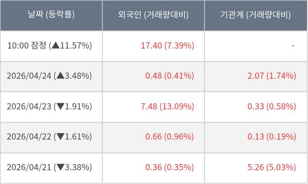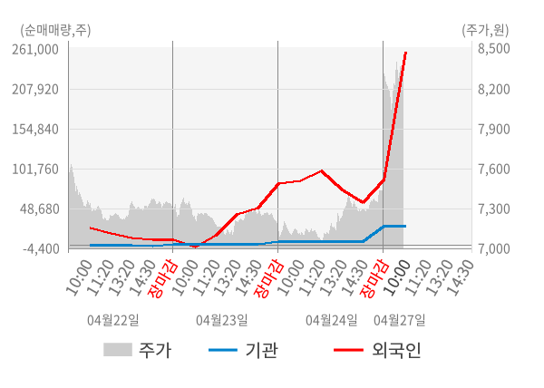 [서울=뉴스핌] 로보뉴스 = 27일 10시 15분 현재 한솔테크닉스(004710)는 전일 대비 11.57% (현재가 8,290원) 상승했고, 외국인이 최근 5일 연속 순매수(누적 26.39만 주, 잠정) 행진을 하고 있다.