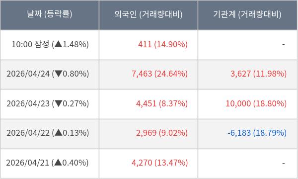 [서울=뉴스핌] 로보뉴스 = 27일 10시 15분 현재 하스(450330)는 전일 대비 1.48% (현재가 7,540원) 상승했고, 외국인이 최근 5일 연속 순매수(누적 19,564주, 잠정) 행진을 하고 있다.