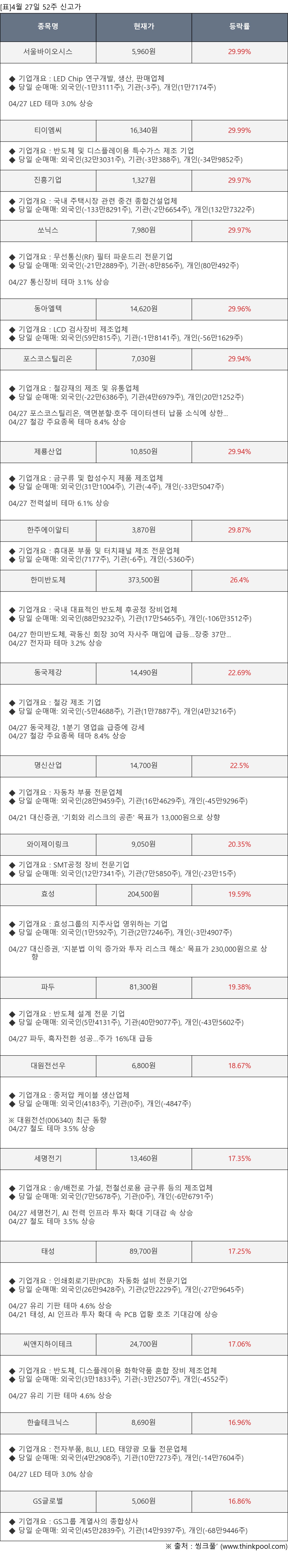 [표]4월 27일 52주 신고가 종목 및 최근 동향