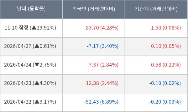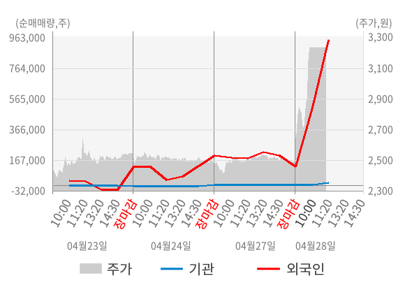 [서울=뉴스핌] 로보뉴스 = 28일 11시 30분 현재 나우IB(293580)는 외국인과 기관이 각각 83.70 만 주, 1.50 만 주 순매수(잠정) 하면서 전일 대비 29.92% (현재가 3,235원) 상승하고 있다.