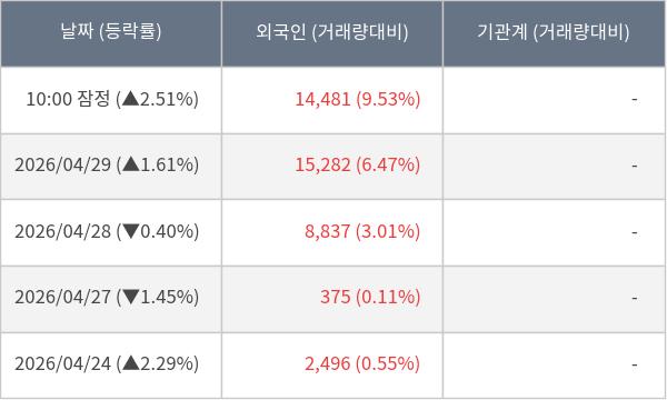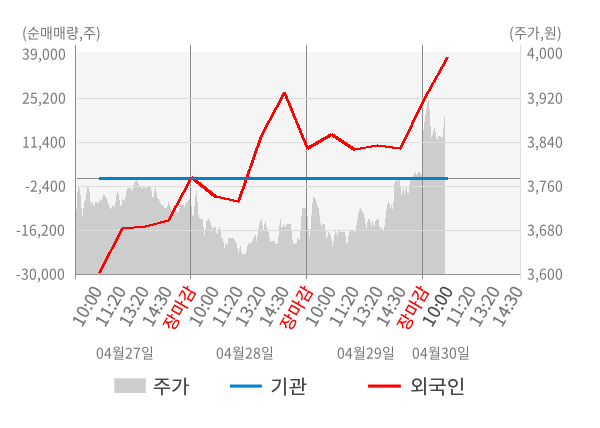 [서울=뉴스핌] 로보뉴스 = 30일 10시 15분 현재 심텍홀딩스(036710)는 전일 대비 2.51% (현재가 3,875원) 상승했고, 외국인이 최근 5일 연속 순매수(누적 41,471주, 잠정) 행진을 하고 있다.