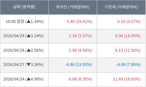 [서울=뉴스핌] 로보뉴스 = 30일 10시 15분 현재 심텍(222800)은 외국인과 기관이 각각 3.40 만 주, 0.10 만 주 순매수(잠정) 하면서 전일 대비 1.34% (현재가 90,500원) 상승하고 있다.