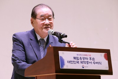 '독립유공자 후손 국적증서 수여식' 축사하는 장호권 광복회장
