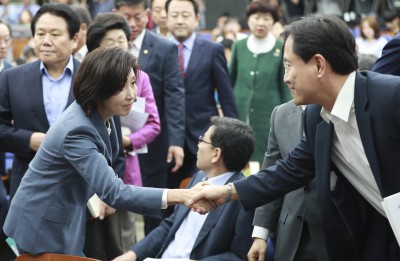 [사진] ‘조국 후보자의 거짓! 실체를 밝힌다 언론 간담회’ 악수 하는 나경원 - 김진태