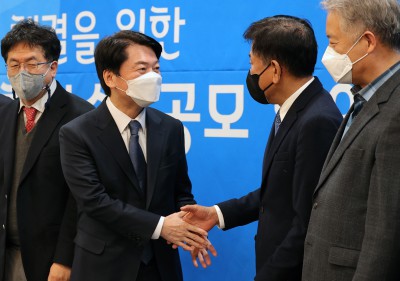 공모당선 대학교 관계자들과 인사 나누는 안철수 대선 후보