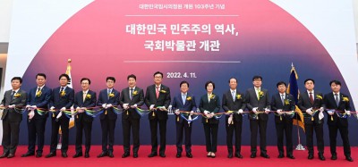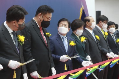 리본커팅하는 박병석 국회의장 - 김상희 - 정진석 부의장