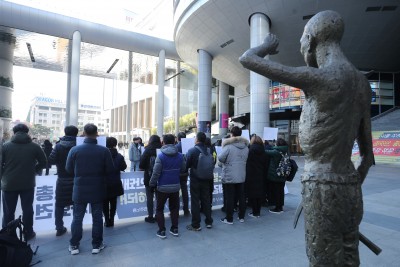 [사진] 노동자상과 함께 구호 외치는 김명환 민주노총 위원장