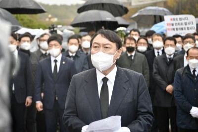 5·18 민주묘지 추모탑 입구에서 참배하는 윤석열 대선후보