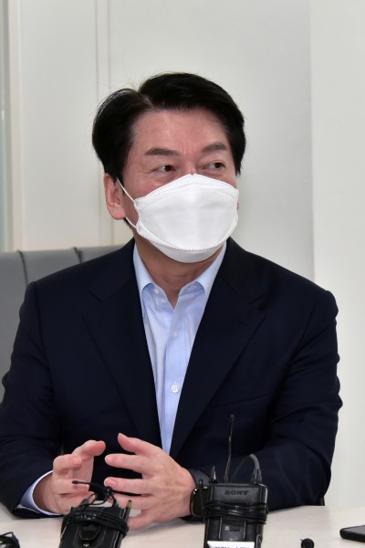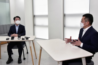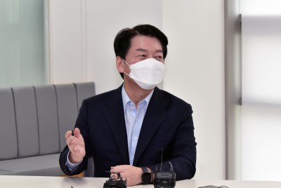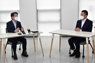 자율주행 기업 김기혁 대표와 대화 나누는 안철수 국미의당 대표