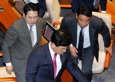 정부조직법 개정안 상정...본회의장 나서는 국힘 의원들