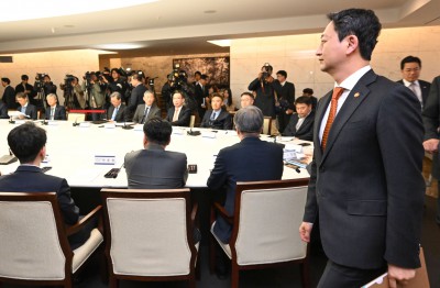 비장한 각오로 회의 참석하는 안덕근 산업통상자원부 장관