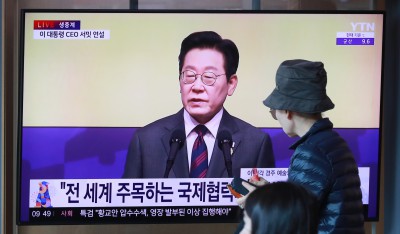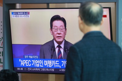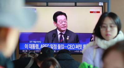 이재명 대통령 APEC CEO 서밋 연설 바라보는 시민들