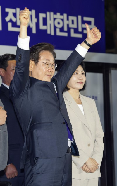 '당선 확실' 손 들어 인사하는 이재명 민주당 대선 후보