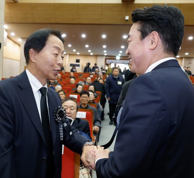 고(故) 김영삼 전 대통령 서거 10주기 추모식, 인사 나누는 김현철-강훈식