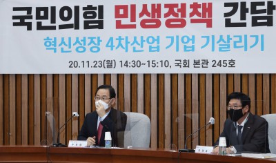 주먹인사하는 주호영 원내대표 - 정재송 코스닥협회 회장