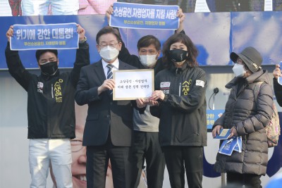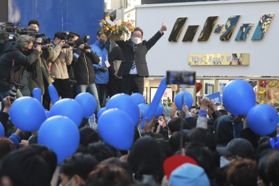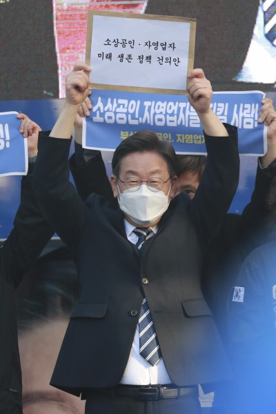 부산 유세 마치고 지지자 향해 인사하는 이재명 대선후보